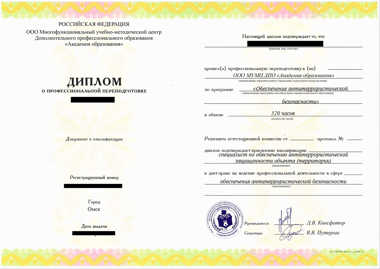 • «Специалист по обеспечению антитеррористической защищенности объекта (территории)» с правом ведения профессиональной деятельности в сфере обеспечения антитеррористической безопасности