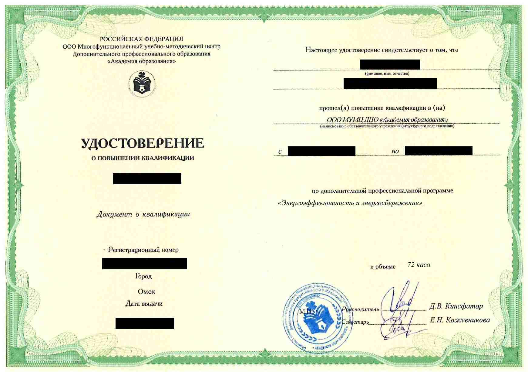 • Удостоверение о повышении квалификации установленного государством образца. Срок действия: 5 лет