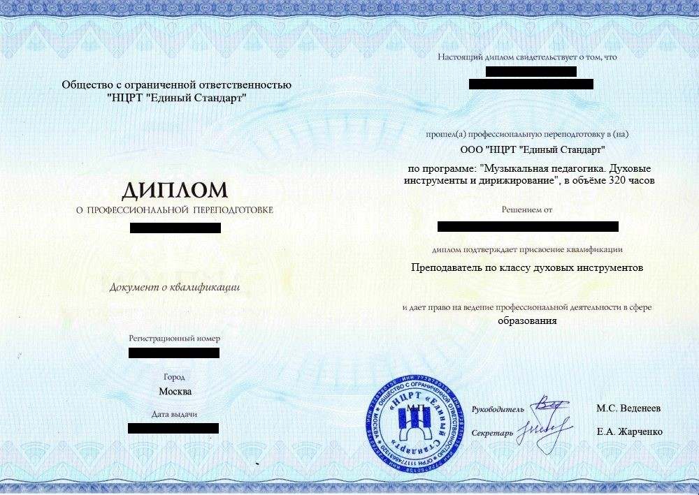 • «Преподаватель по классу духовых инструментов» с правом ведения профессиональной деятельности в сфере образования